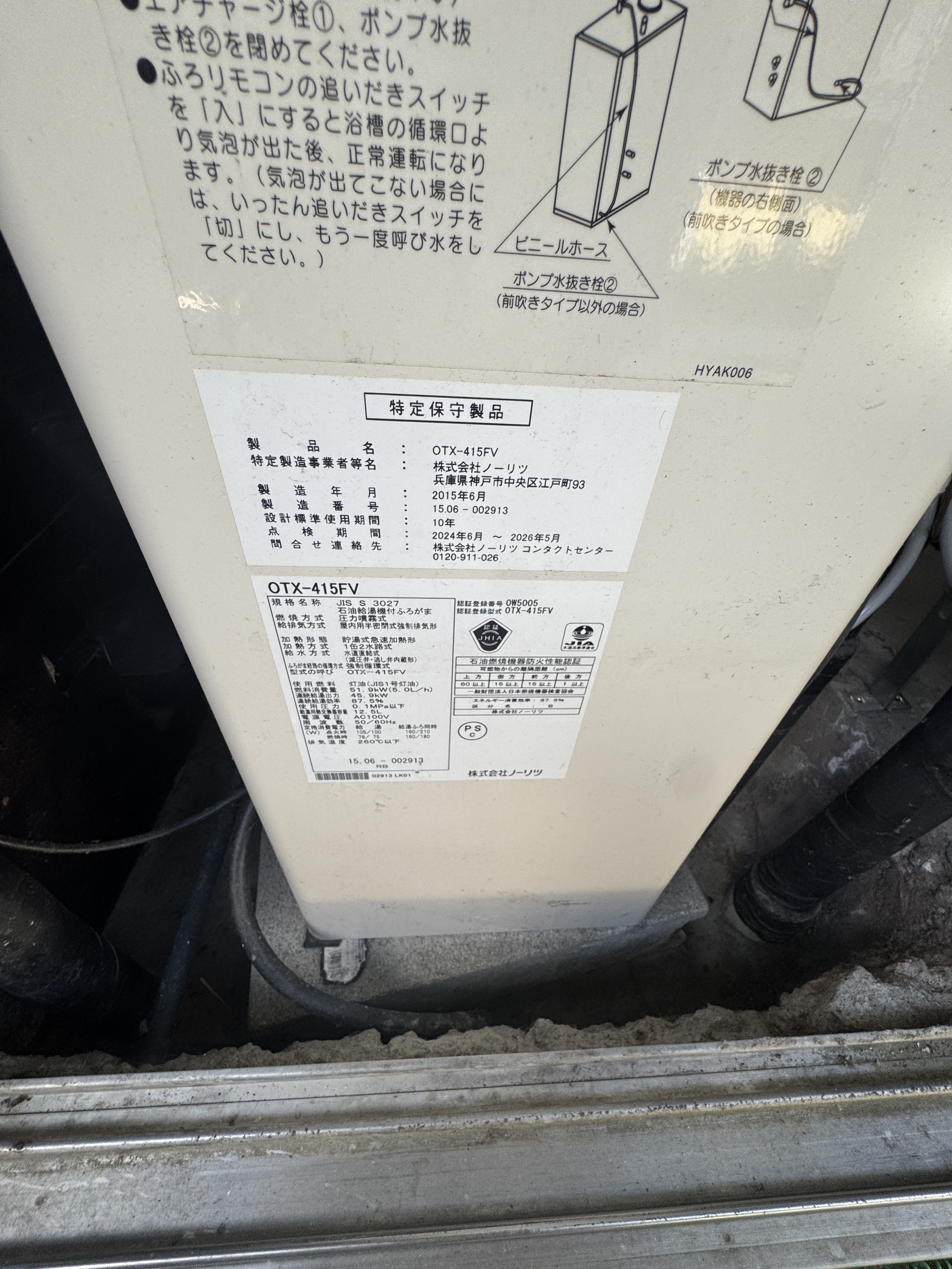 こちらのお客さまはNORITZの石油給湯器、OTX-415FVを10年お使いで、追い炊きはできるがシャワーなどのお湯が細くて困るとご連絡いただき、