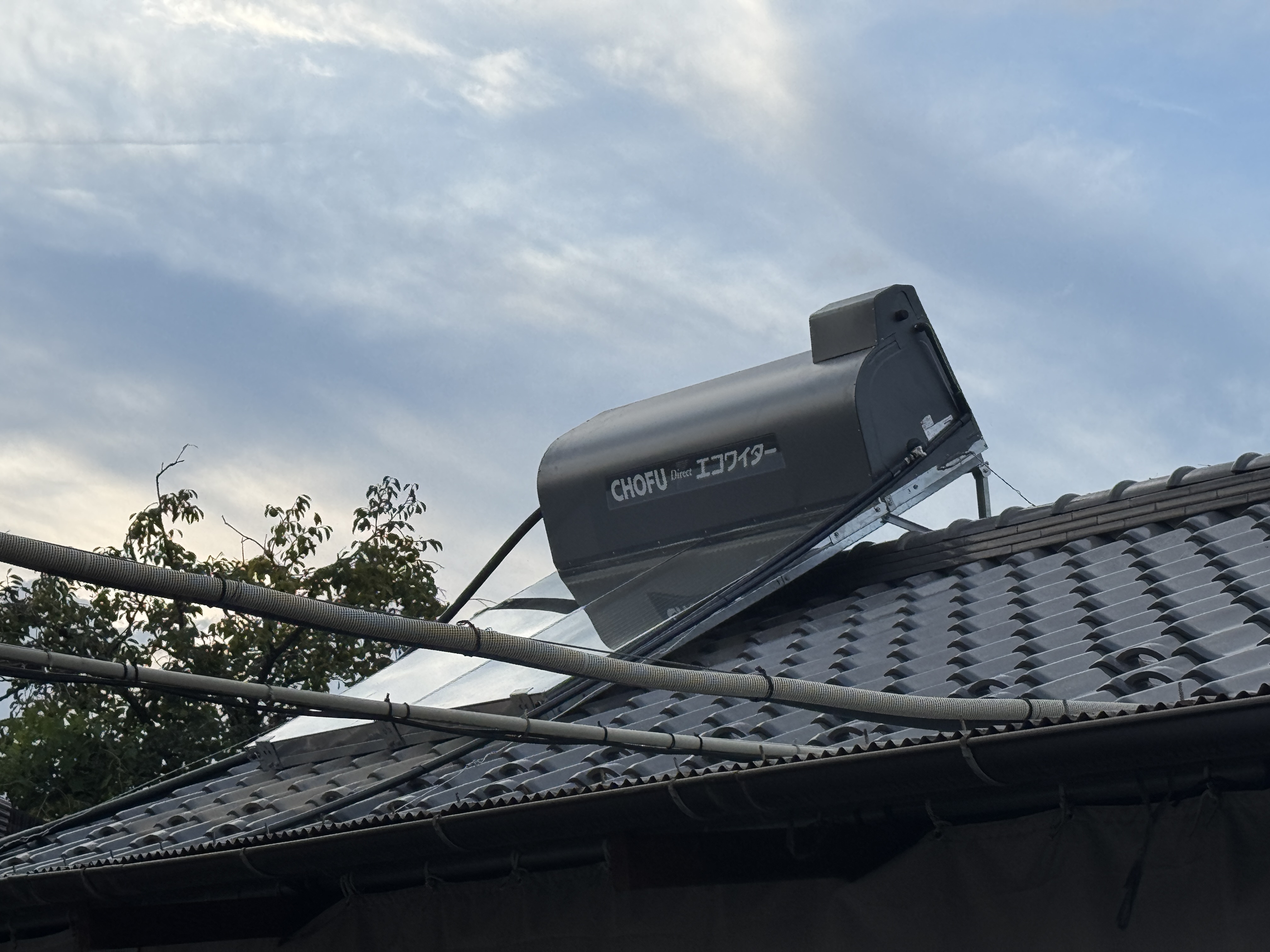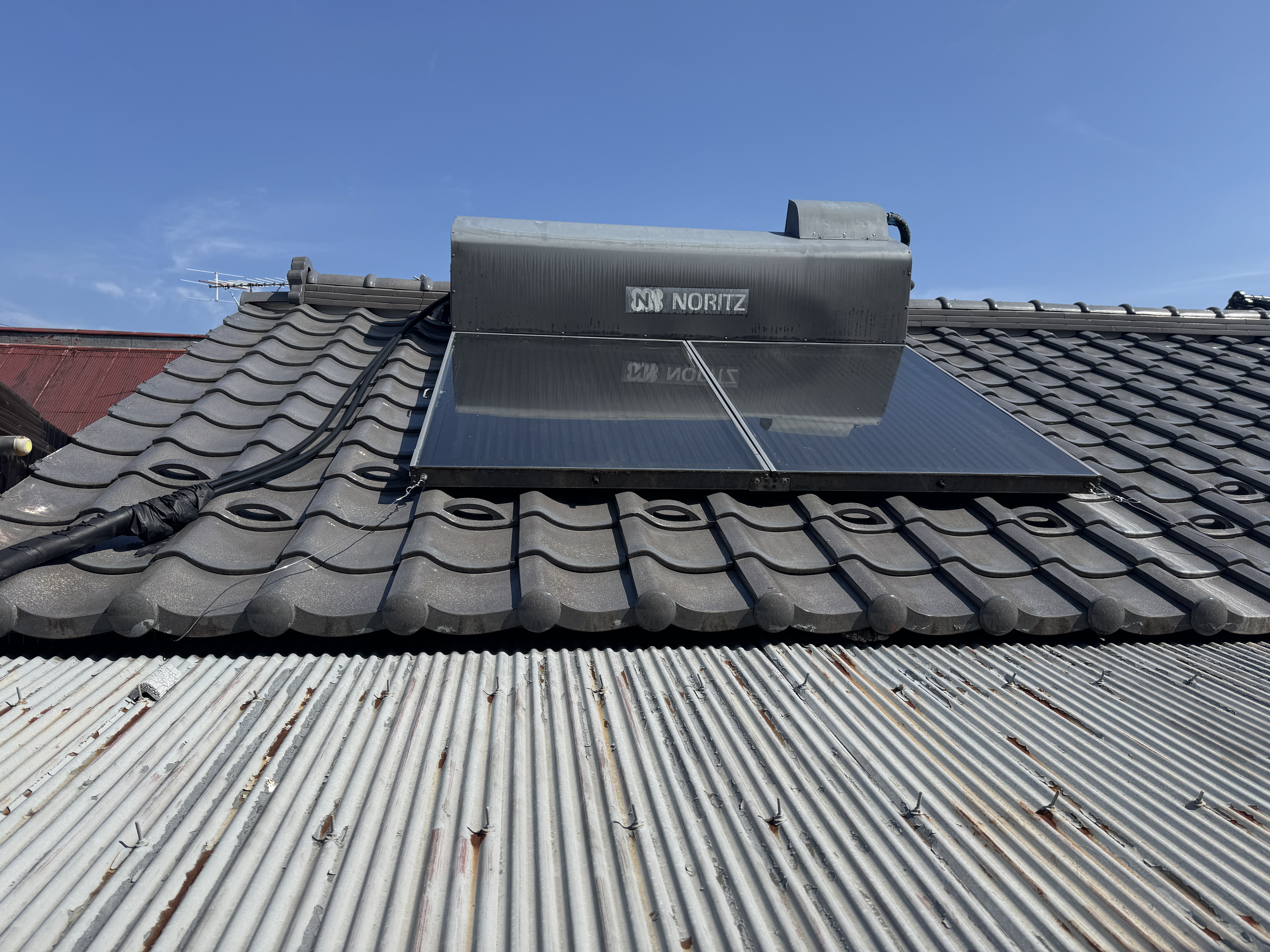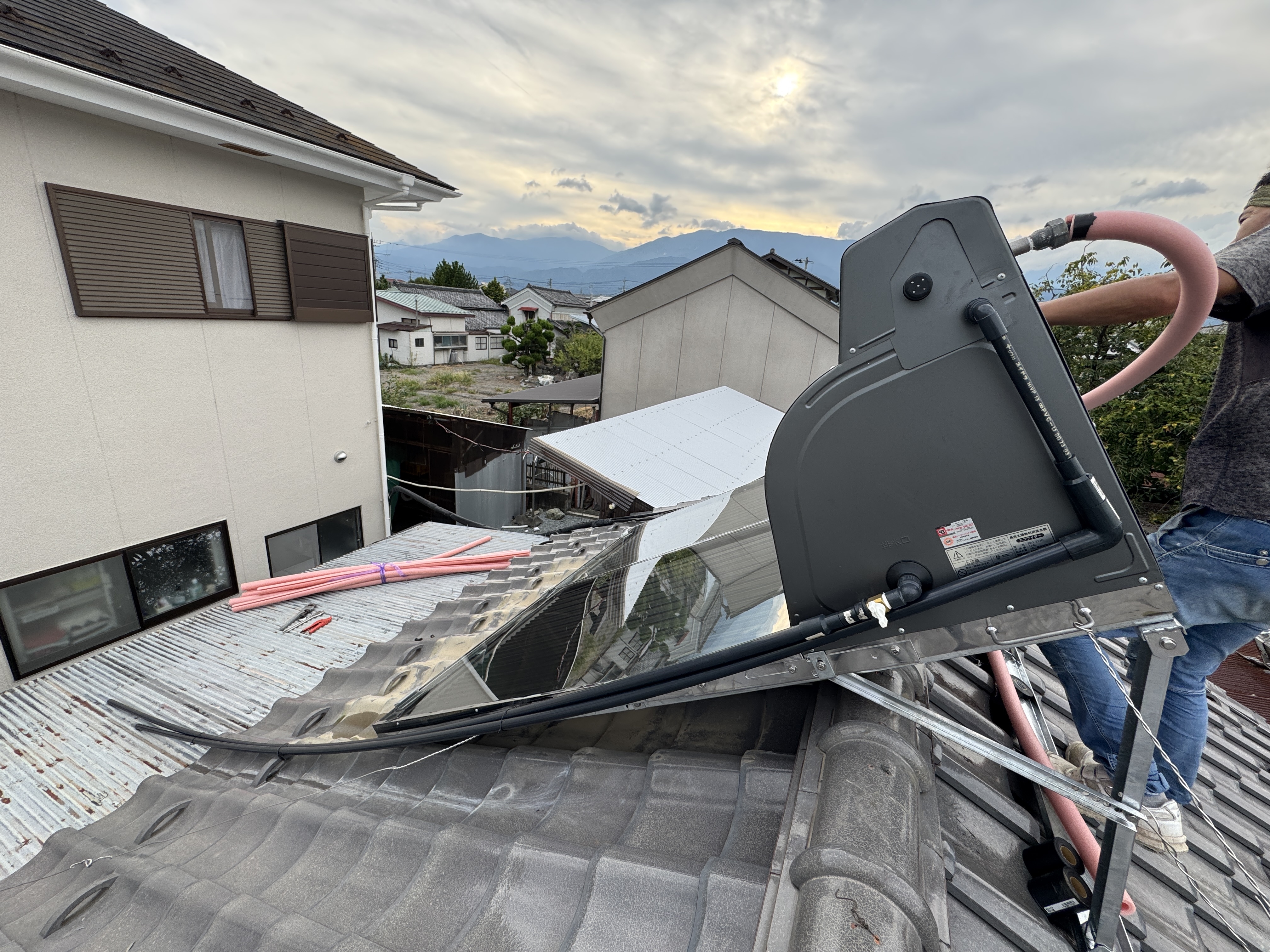9/10はNORITZの太陽熱温水器が少し下にずれ落ちているということと、太陽熱温水器の日当たりをよくしたいとのことで長府製作所の直圧式太陽熱温水器、SW1-213Dを架台付きで取り付けました。