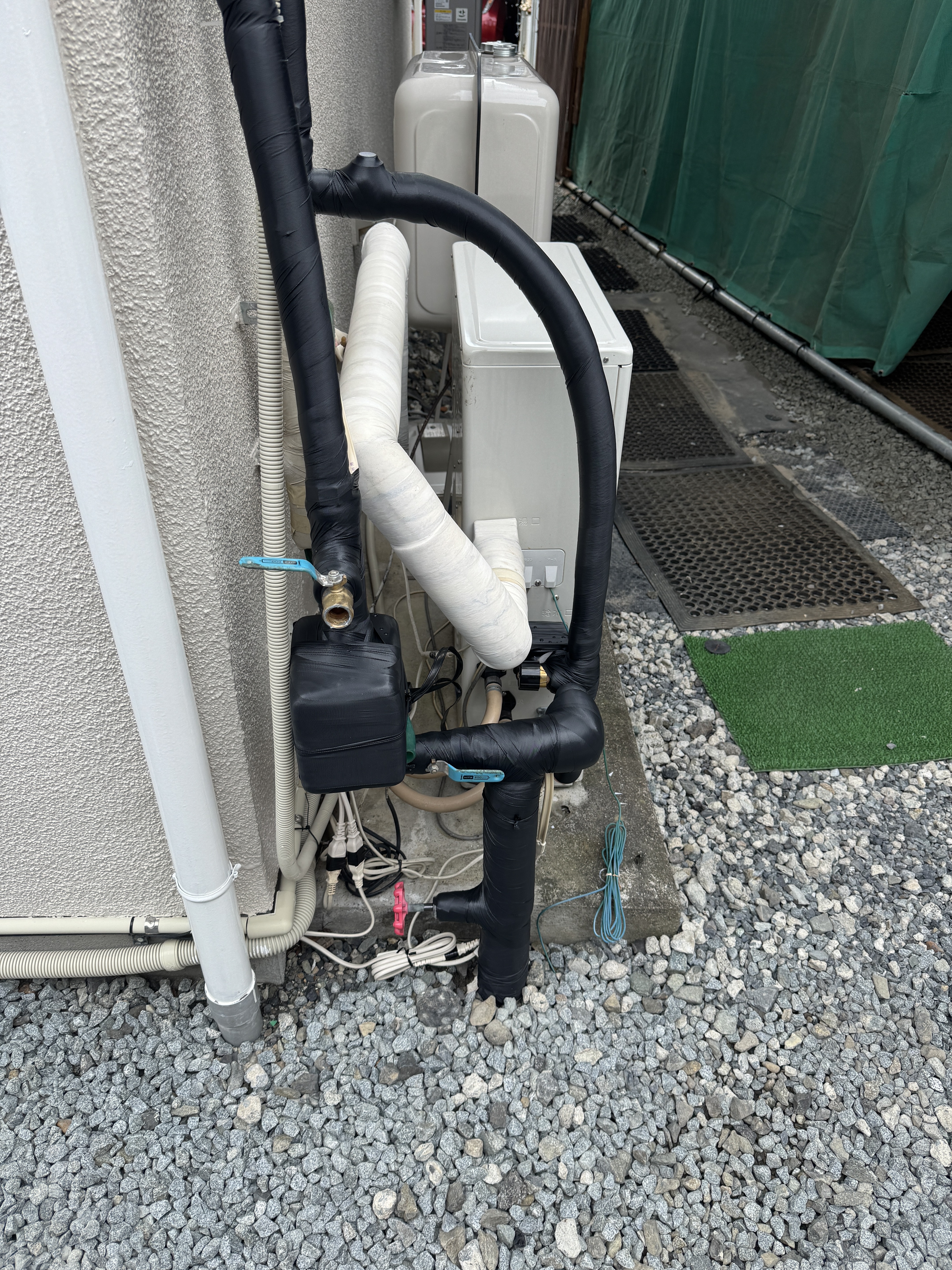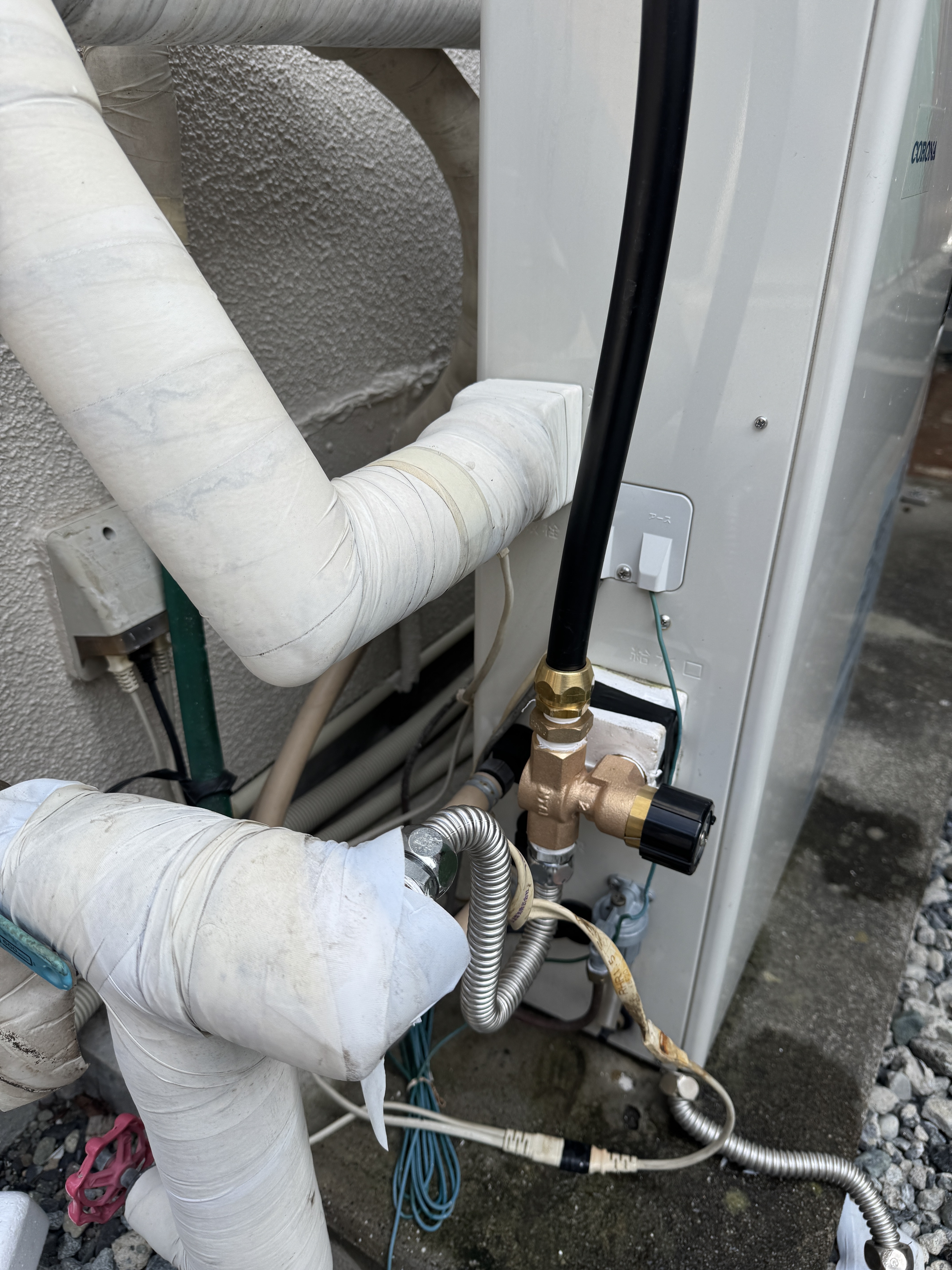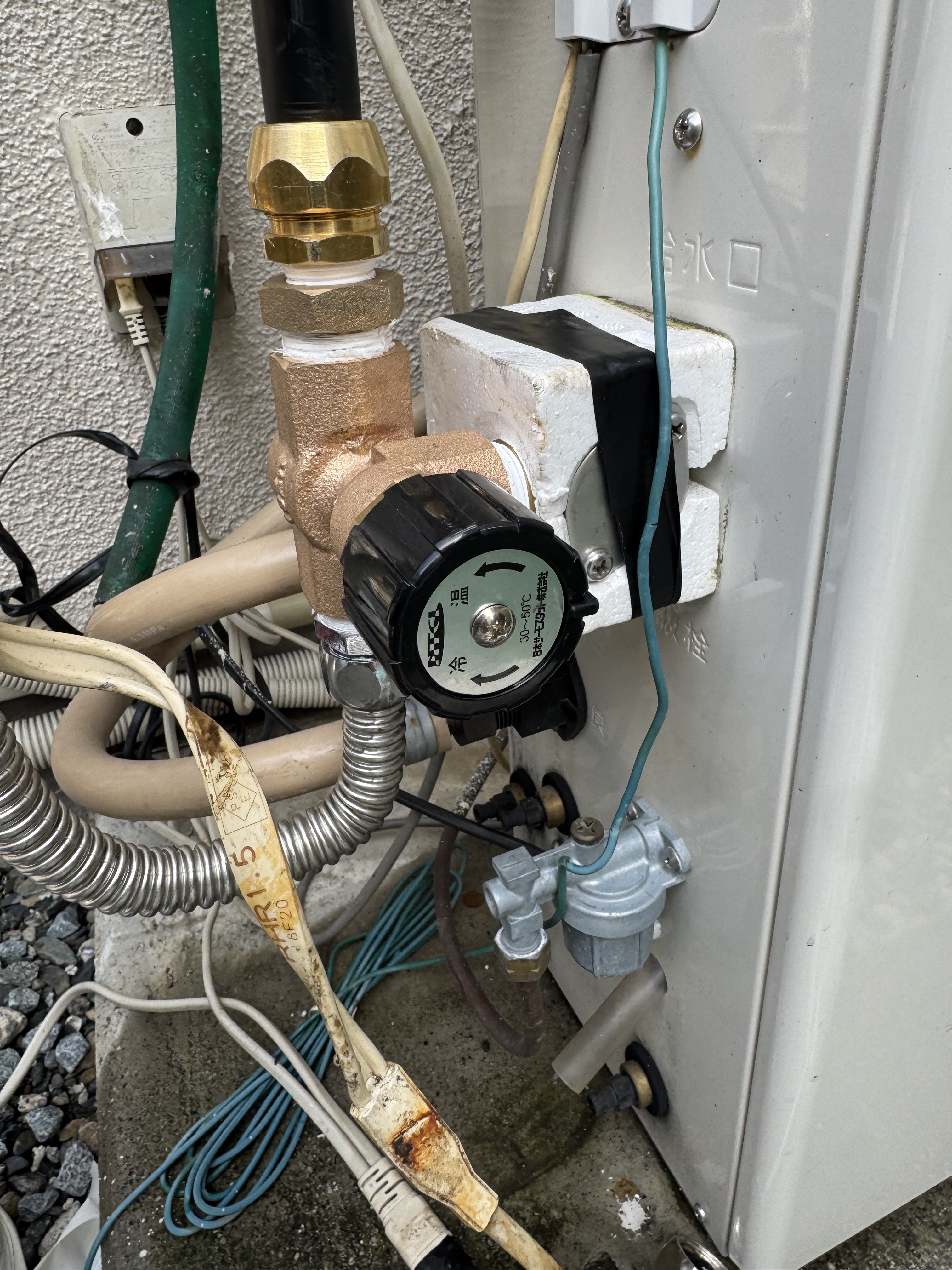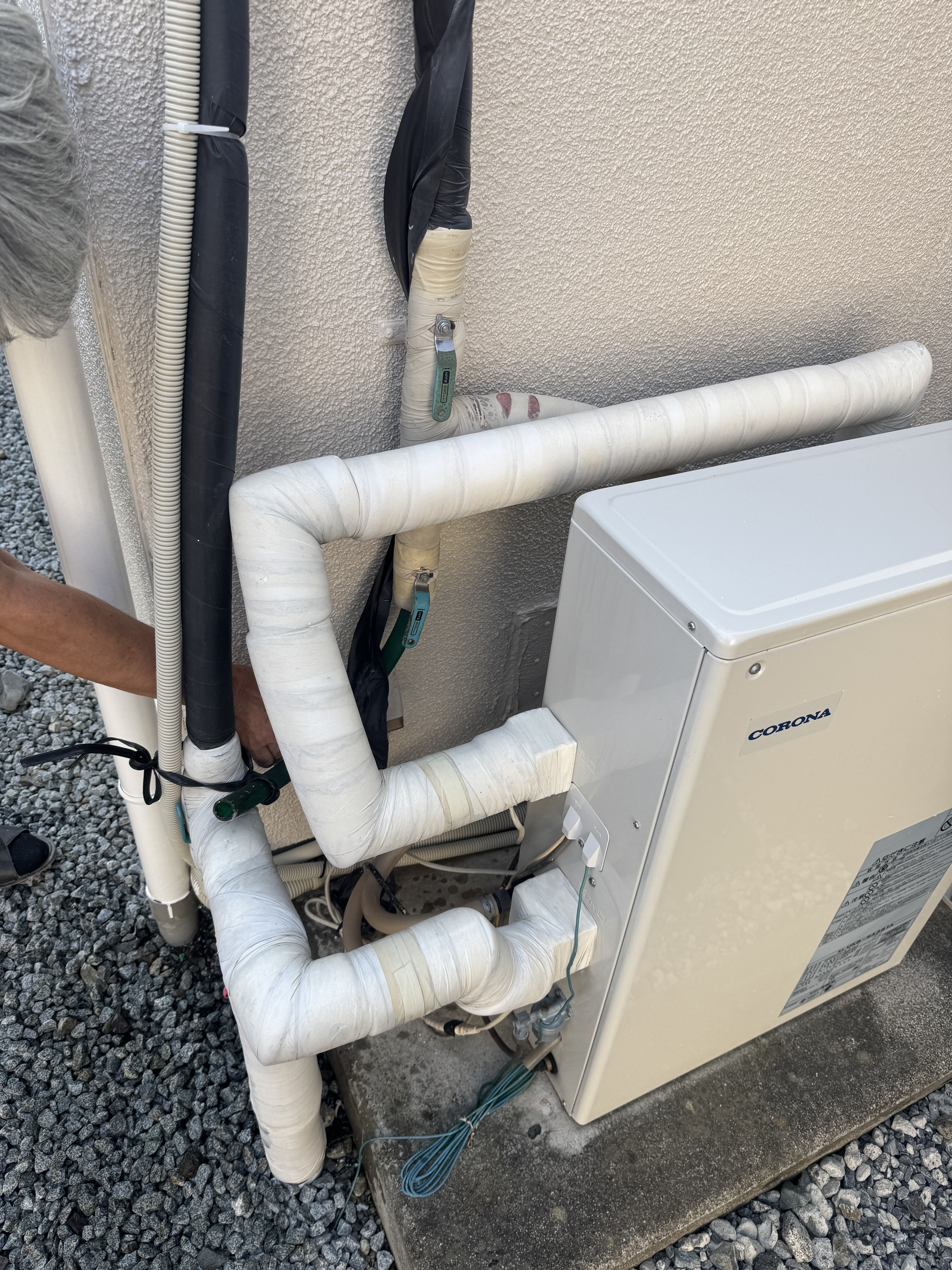 今まではお風呂の浴槽だけに太陽熱温水器のお湯を落とし込むだけだったのですが、今回は直圧式ということもあり、ミキシングバルブを使用してコロナの直圧式石油給湯器に接続いたしました。
